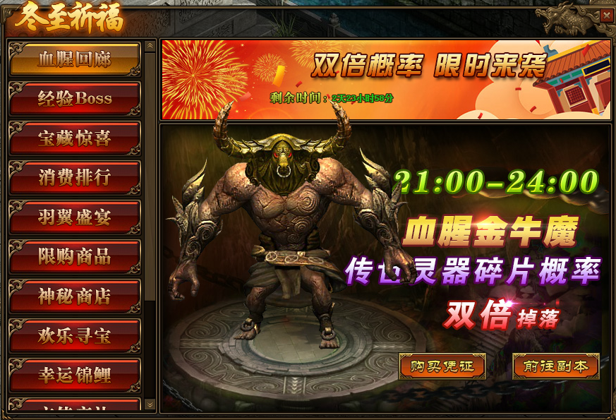 1.活动期间,玩家参与“多人副本-血腥回廊”,获得“传世灵器碎片”的概率翻倍;