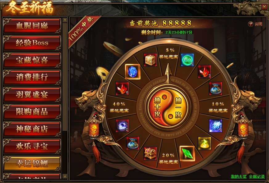 1.活动开启后奖池内默认存入88888元宝,每抽奖1次可使奖池内增加100元宝