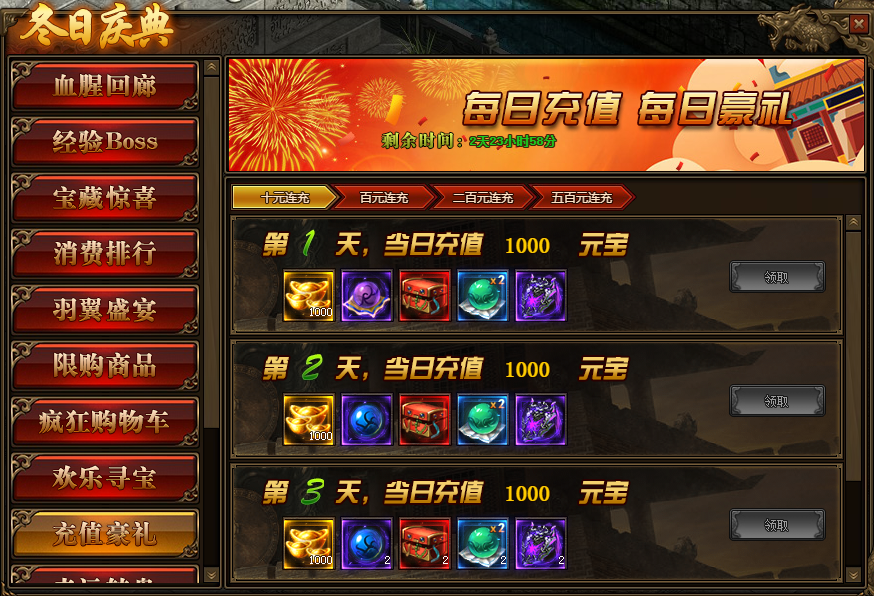 2.连续充值达到3天,奖励翻倍领,更可领取暗影晶石、地狱晶石、随机7级阵法宝珠、雷霆装备等贵重物品