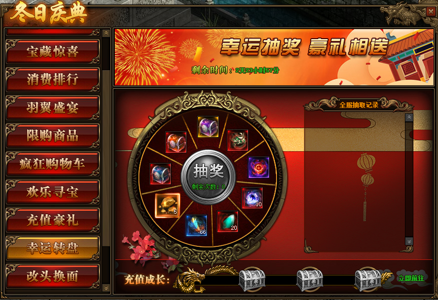 1.活动期间内,每日充值可增加充值成长值,达到一定充值成长值后可领取抽奖次数,每日最多获得3次抽奖机会;