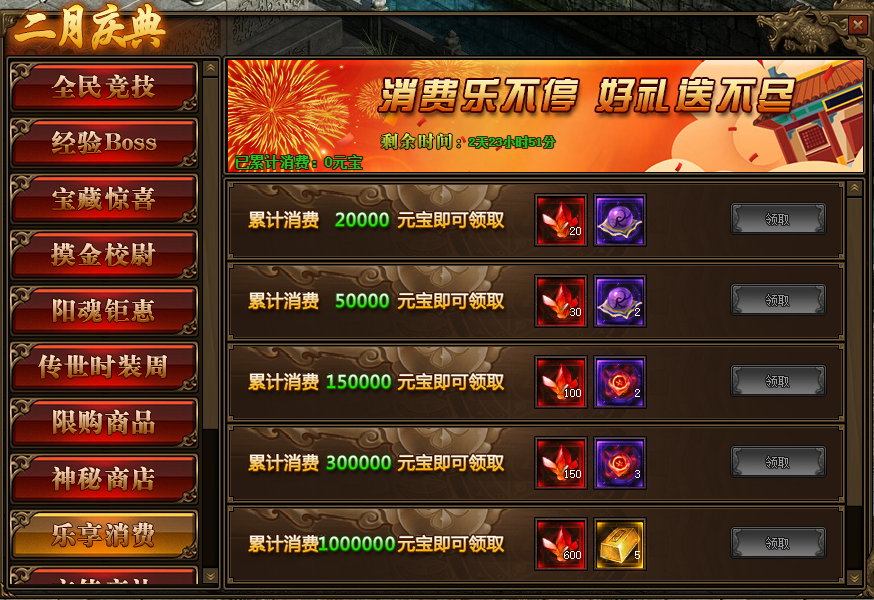1.活动期间,玩家累计消费满足要求,可以领取境界修为、本职业星石、传世灵戒等相应奖励;