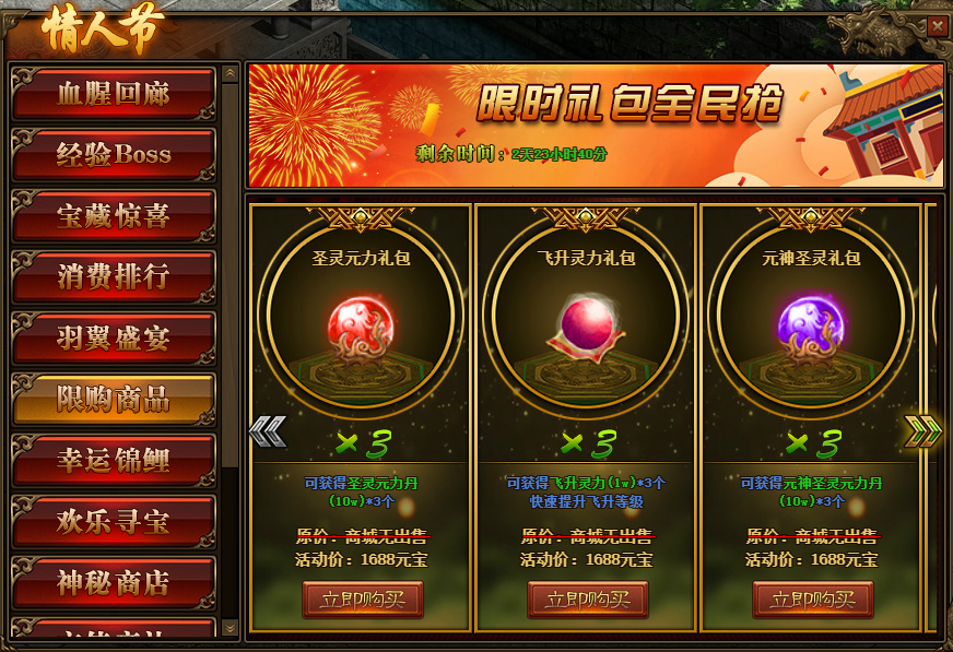 1.活动期间,玩家可在活动面板购买限购商品;(可翻页)