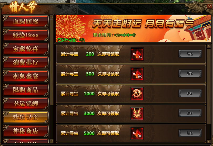 1.活动期间,玩家累积寻宝次数满足要求,可以领取本职业星石、本职业仙装、传世仙装等相应奖励;