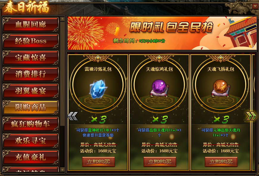 1.活动期间,玩家可在活动面板购买限购商品;(可翻页)
