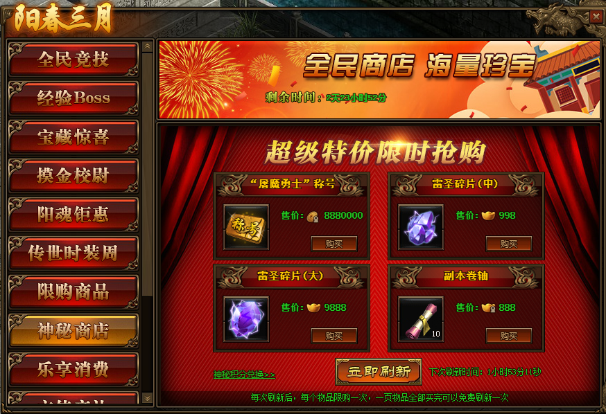 2.神秘商店每2小时自动刷新一次,也可用花费元宝立即刷新;