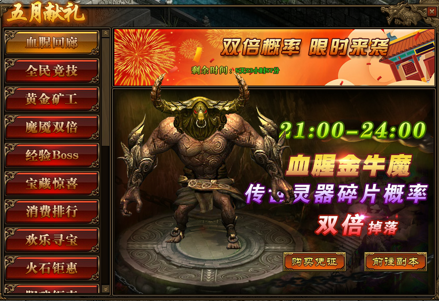1.活动期间,玩家参与“多人副本-血腥回廊”,获得“传世灵器碎片”的概率翻倍;