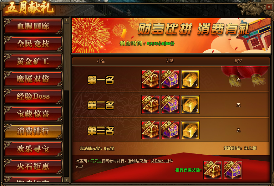 1.活动期间,玩家消费满30万元宝参与排行