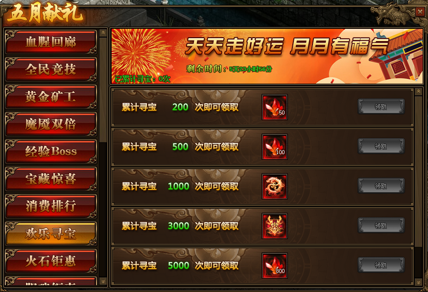 1.活动期间,玩家累积寻宝次数满足要求,可以领取本职业星石、本职业仙装、传世仙装等相应奖励。