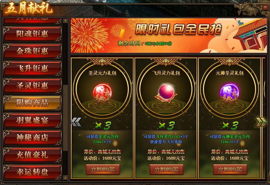 1.活动期间,玩家可在活动面板购买限购商品;(可翻页)