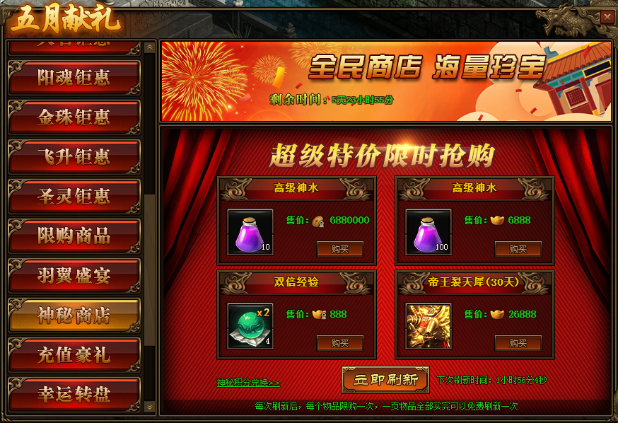 1.活动期间,玩家可在神秘商店中购买商品,商品可用金币,绑元,元宝进行购买;