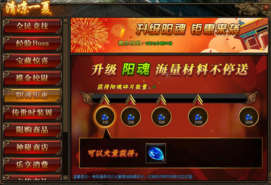 1.活动期间,玩家获得阳魂碎片数量,达到条件可领取对应阳魂碎片奖励。