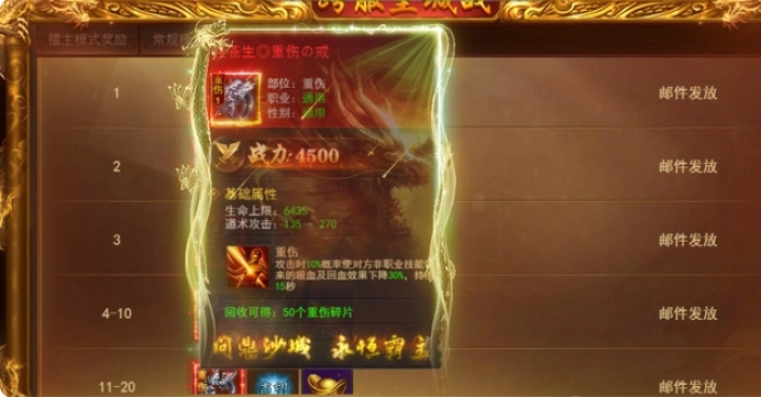 1.跨服皇城战:在开服第36天后,重伤特戒将开放获取。玩家可以通过参与跨服皇城战活动,根据个人排名和达标奖励领取特戒碎片,进而合成完整的重伤特戒。