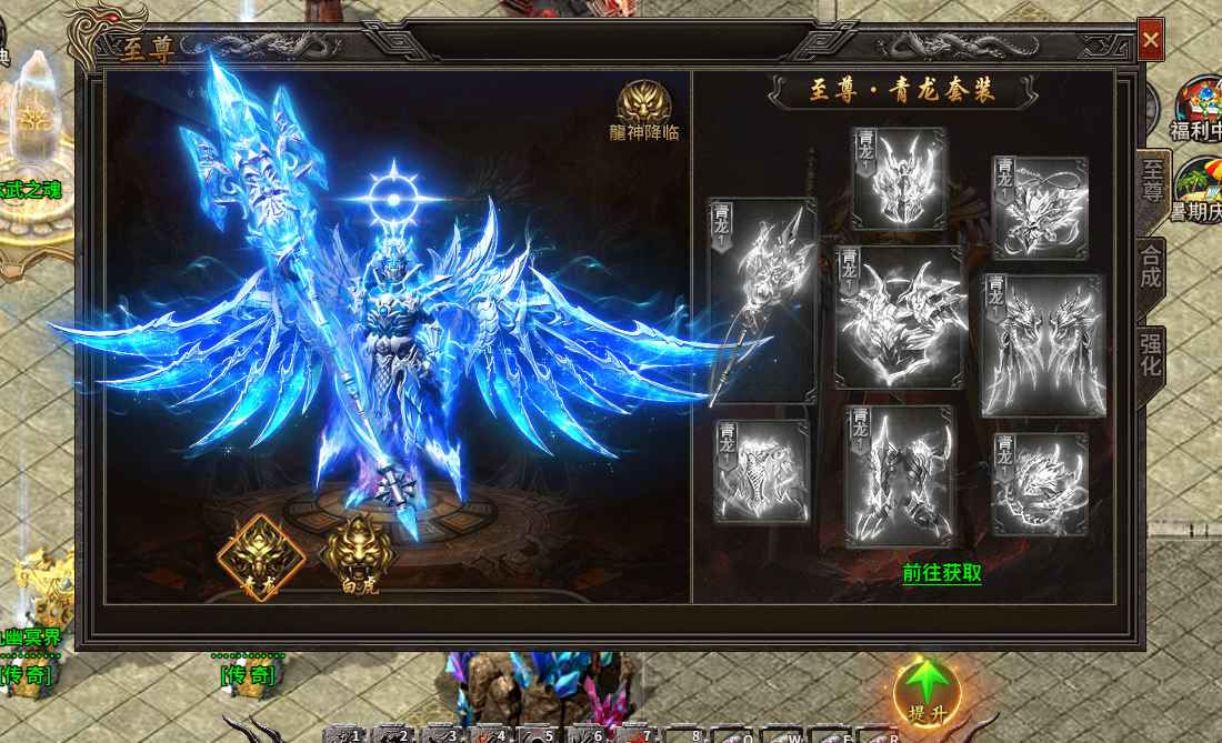 1. 今天给大家介绍一下至尊青龙套装怎么获取,玩家可以在跨服地图诛魔法阵中击杀BOSS,地图内有110只BOSS,击杀有一定几率爆天威青龙系列首饰装备。