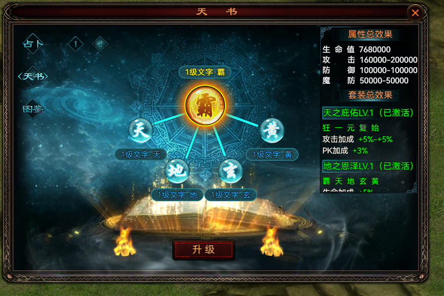 占卜出的buff效果直接生效,重复获得可提升buff效果,占卜出的天书残叶可合成天书文字(只可合成一级天书),占卜出的顿悟书页可前往天书界面来升级天书文字,凑齐狂、一、元、复、始可以激活天之庇佑,天之庇佑可以攻击加成和pk加成,凑齐霸、天、地、玄、黄可以激活地之恩泽,地之恩泽可以提供生命加成、防御加成、魔防加成、pk减免。