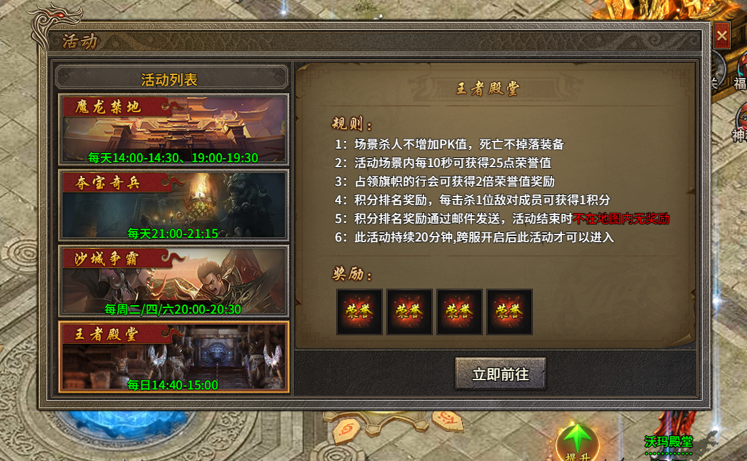 1. 今天给大家介绍一下王者殿堂活动介绍,王者殿堂活动活动每日14点40-15点开启,场景杀人不增加PK值,死亡不掉落装备。