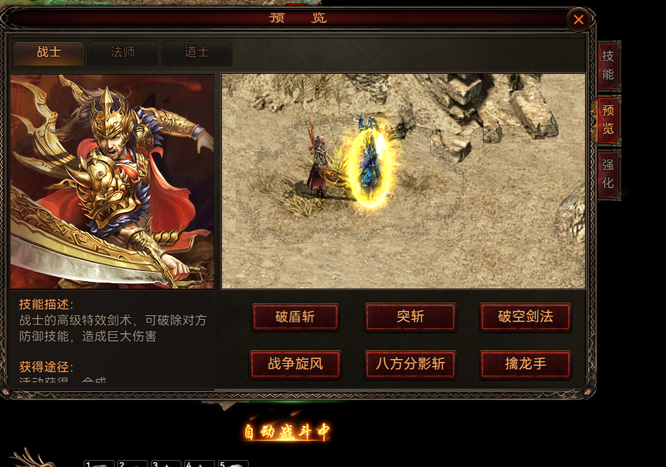 四圣封神是一款传世元神极致攻速的传奇游戏,独特的三元神,酷炫的技能特效,合击神技秒杀boss,四圣封神高级战士技能有破盾斩、突斩、破空剑法、战争旋风、八方分影斩、擒龙手,破盾斩:战士高级特效剑术,可以破除对方的防御技能,造成巨大伤害,可以通过活动或者合成获取,突斩:战士的连击剑术,面对境界低于自己的对手可以向前突进,同时进行连续攻击,刀光剑影取人首级,可以通过开服活动或者合成获取,破空剑法:对3格直线目标上的敌人造成强大的穿透伤害,无视目标一定比例防御,可以通过合成获取(开服31天投放),战争旋风:释放技能时可对大范围的敌人造成伤害,可以通过开服30天活动获取,八方分影斩:快速接近对方并释放分身之术击中敌人并造成短暂定身,可以通过开服180天活动获取,擒龙手:可以将远处的敌人瞬间拉倒身边,可以通过活动或者合成获取。