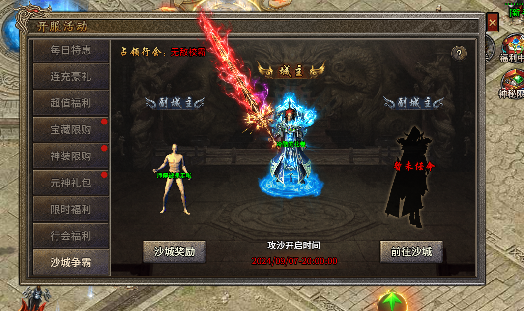 2. 攻城活动开启一分钟前,皇宫无归属,一分支后皇宫仅剩一个行会,可暂时占领皇宫至20.30结束时占领皇宫行会可获得沙城归属。