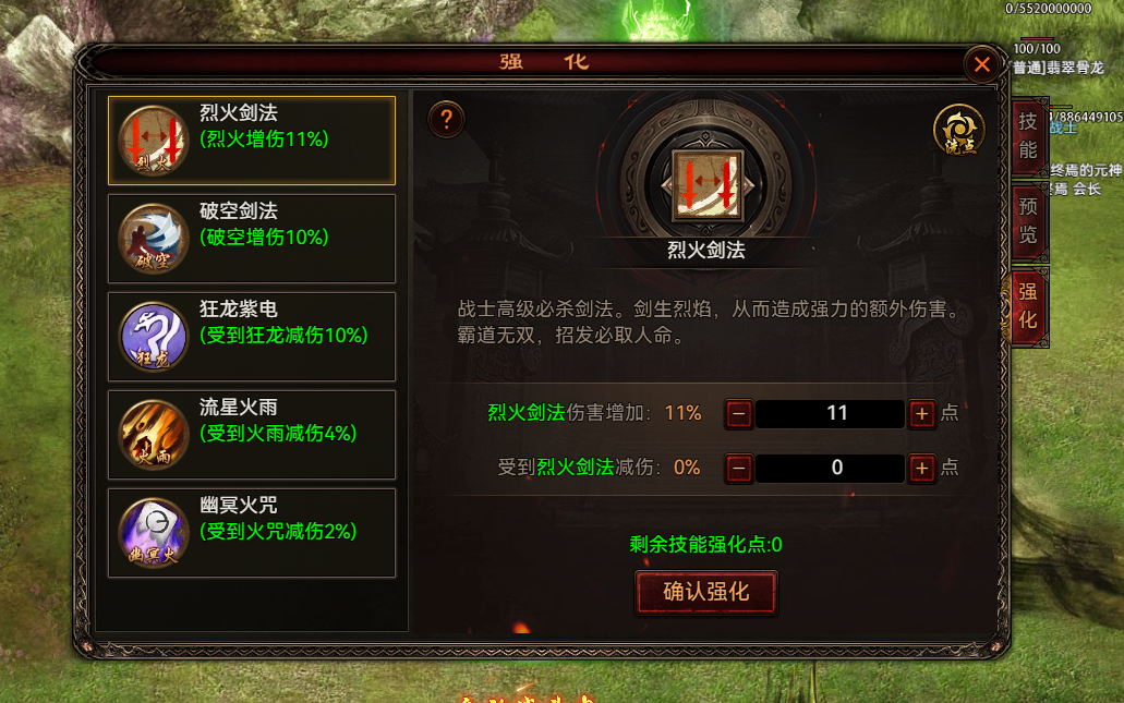 化点全部重置,每种强化默认最高30级,级数会随着天服天数增加,可以强化的技能有烈火剑法、破空剑法、狂龙紫电、流星火雨、幽冥火咒,烈火剑法强化可以选择伤害增加、受到烈火剑法减伤,破空剑法强化可以选择伤害增加、受到破空剑法减伤,狂龙紫电可以选择受到狂龙紫电减伤,流星火雨可以选择受到流星火雨减伤,幽冥火咒可以选择受到幽冥火咒减伤。 相关文章