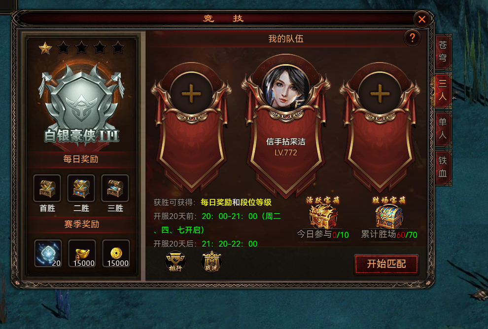 四圣封神是一款传世元神极致攻速的传奇游戏,独特的三元神,酷炫的技能特效,合击神技秒杀boss,四圣封神3v3活动,活动时间每天20.00-21.00,在活动时间内,获胜可以获得,每日奖励并提升段位等级,每个自然月为一个赛季,每个赛季结束后,会根据段位通过邮件发放赛季奖励,每参加一场比赛可以获得一个活跃宝箱,宝箱通过邮件发放,每日最多可以获得10个宝箱,每日奖励分为首胜、二胜、三胜宝箱奖励,胜利宝箱可以获得大量龙魂之晶和勋章结晶以及功勋,胜场宝箱达到一定数量后还可以获得胜场宝箱,可以获得大量充值红包。