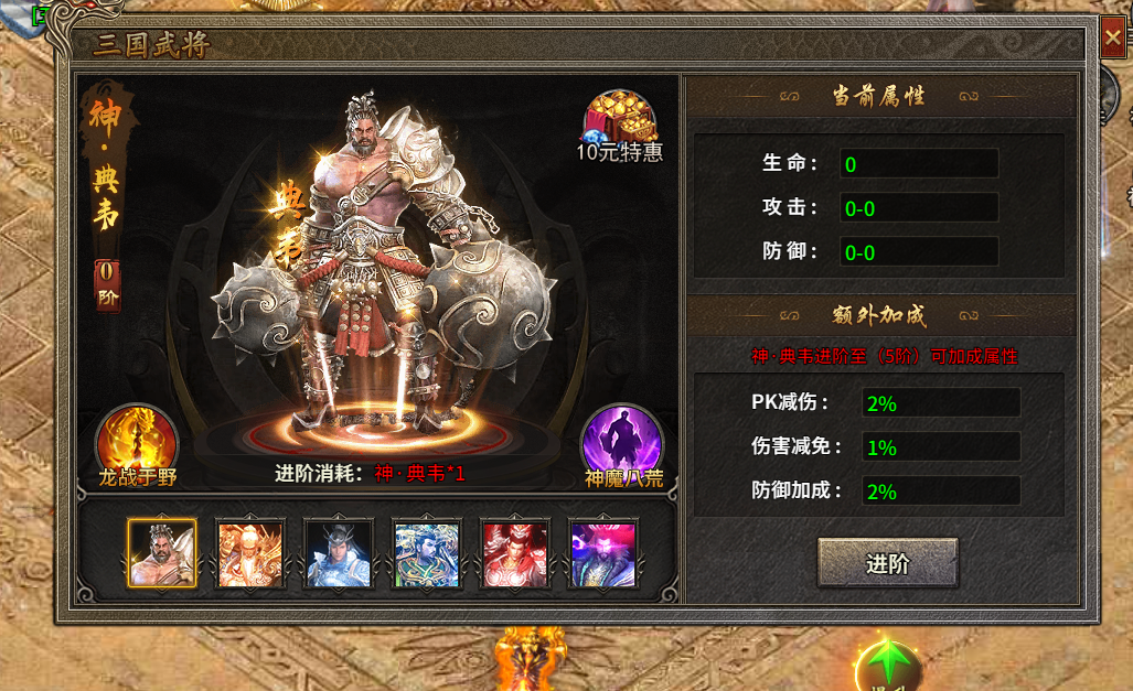 1. 今天给大家介绍一下三国武将介绍,三国武将进阶可以增加属性,典韦、黄忠、马超武将升阶到20阶可以激活龙战于野技能,攻击怪物的时候有高几率可以触发10W全屏切割伤害。
