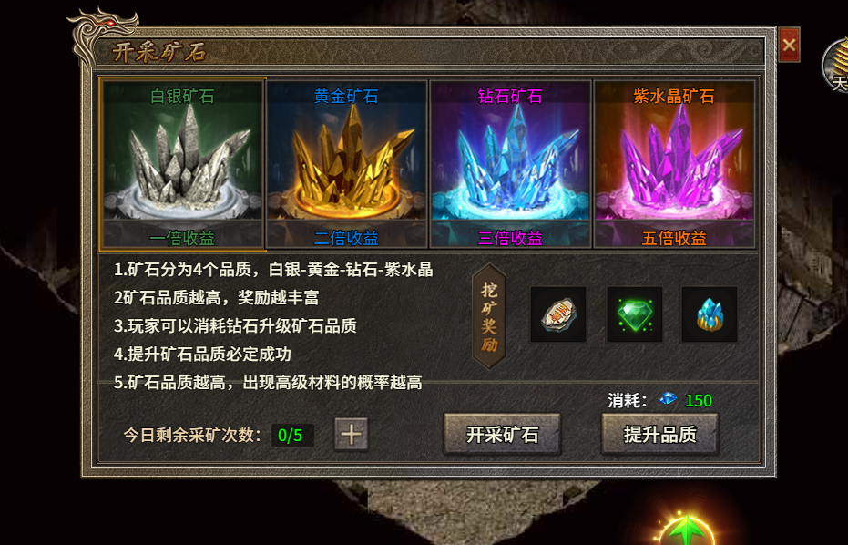 1. 今天给大家介绍一下开采矿石介绍,矿石分为四个品质,白银、黄金、钻石、紫水晶,矿石的品质越高,奖励月丰富,提升品质需要消耗150钻石。玩家可以消耗钻石升阶矿石品质。