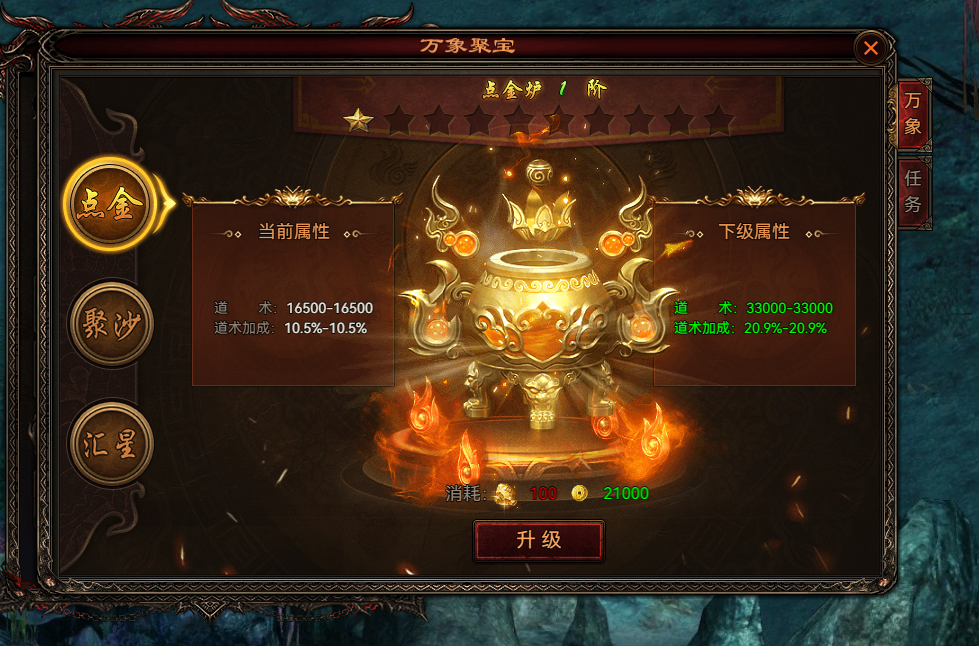四圣封神是一款传世元神极致攻速的传奇游戏,独特的三元神,酷炫的技能特效,合击神技秒杀boss,四圣封神万象聚宝分为点金炉、聚沙环、汇星烛,点金提供攻击和攻击加成,聚沙提供生命值、魔法值、生命加成、防御加成、魔防加成,汇星提供防御、魔防、生命加成、防御加成、魔防加成,升级点金炉需要点金石,完成点金炉相关任务可以获得点金石,点金炉任务分为境界达标、特戒总等级达标、神龙之魂达标、卓越勋章达标、镇魔珠等级达标、激活羽翼等级、军衔达标,聚沙环任务完成可以获得聚沙珠,聚沙环任务分为行会夺旗击杀玩家达标、沙城争霸击杀玩家达标、跨服苍穹要塞击杀玩家达标,汇星烛任务完成可以获得汇星岩,汇星烛任务分为每日领取副本奖励、击杀凶兽达标。
