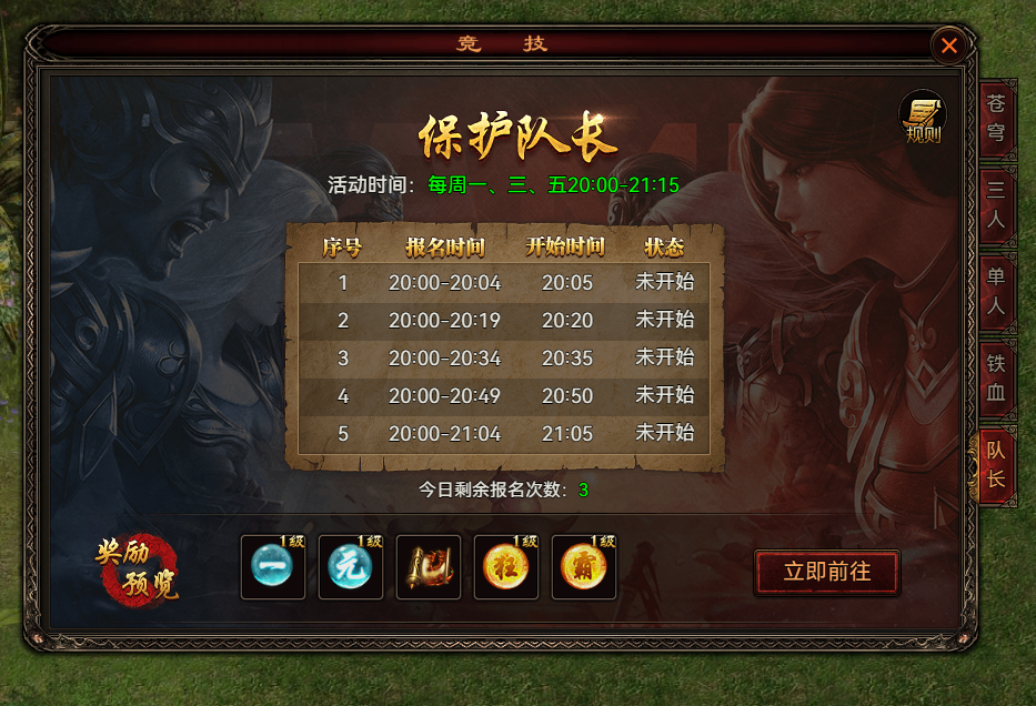 四圣封神是一款传世元神极致攻速的传奇游戏,独特的三元神,酷炫的技能特效,合击神技秒杀boss,四圣封神保护队长活动每周一、三、五晚上20.00-21.15开启,每日3次报名次数,只有队长剩余可复活次数不为0,队员即可无限复活,队长可复活次数为0时,活动结束,8v8,随机分配红、蓝阵营,双方阵营随机一名队长,队长可复活次数为0时,活动结束,队长逃跑队长立即转移至其他玩家,并且阵营可复活次数-1,队长死亡时,队长身份转移至其他队员,队长被击杀的一方队员获得增益buff,活动进行到一定时间,全员将获得增益buff。