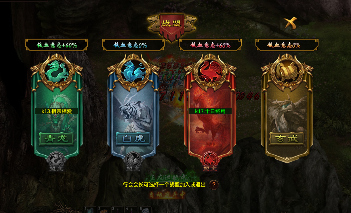 战盟分为4个,分别是青龙,白虎,朱雀,玄武 四个战盟,每个战盟代表不同的区服联盟,大家一起联合PK,多刺激。