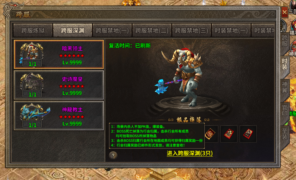 2. 击杀BOSS归属行会所在地图成员均可获得归属奖励一份,行会归属奖励已邮件的形式进行发放,玩家可以在击杀BOSS之后,查看邮件获取奖励。跨服深渊BOSS可掉落神器晶石和图鉴。