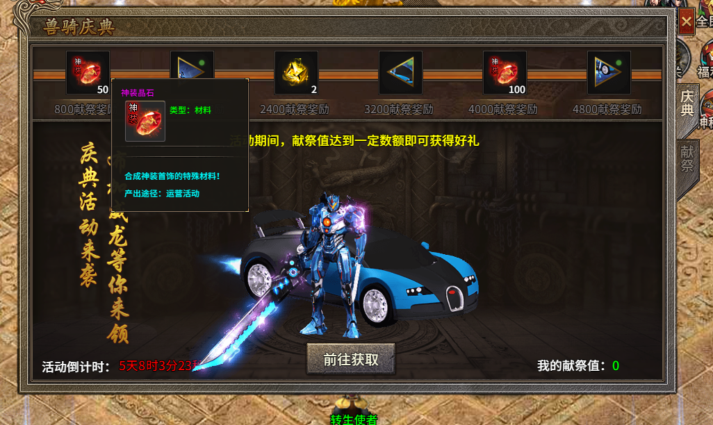 2.每天献祭值达到个人达到700可以领取个人礼包,行会献祭值达到12500可以领取行会礼包,个人献祭值达到9600点即可领取布加迪威龙所有碎片激活时装。