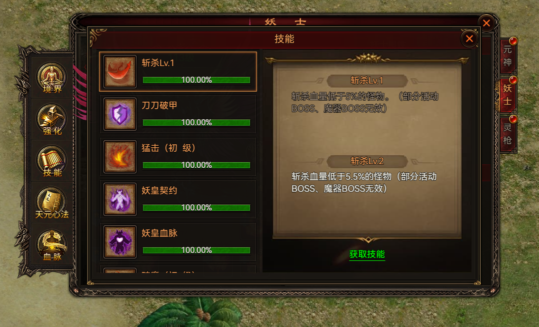 妖士的元神技能可以通过购买限时大礼、周末活动、技能商城、合成获得。