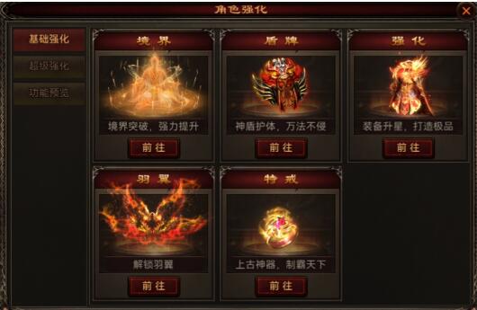 角色强化攻略:基础强化可通过境界/盾牌/强化/羽翼/特戒进行角色强化。境界升级需要境界丹,主要靠boss挑战升级,想快速升级可通过商城购买。装备强化需要铁矿和金币,都有商城购买途径。盾牌合成需要上一级的元灵盾牌和盾牌碎片。羽翼升级需要绑金,可商城购买。超级强化有三个途径:神龙之魂/卓越勋章/传世护符。神龙之魂强化需要龙魂之晶和通宝,升级主要靠日常活跃,可商城购买快速升级。卓越勋章需获取卓越结晶,主要通过至尊祈福/每日活跃/商城购买。传世护符需获取符文碎片,主要通过比武大会助力/活动礼包获取。