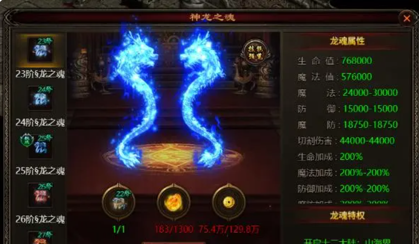 22 阶龙之魂升级到 23 阶龙之魂:需要 22 阶神龙之魂、神龙之魂1300、通宝129.8 万。