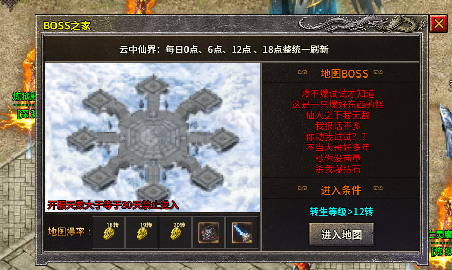 1. 今天给大家介绍一下虎符传奇云中仙界介绍,云中仙界需要开服30天开启,进入条件需要角色转身等级大于等于12转,每天BOSS刷新时间分别是0点、6点、12点、18点统一刷新,其他时间点进入不了地图。