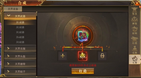 打造条件:使用225阶及以上战装和天界材料可打造天界战装。