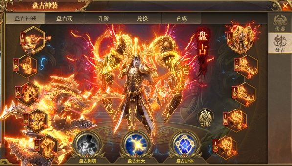套装激活:玩家需要集齐盘古神装的全套装备,达到3阶即可激活套装效果。