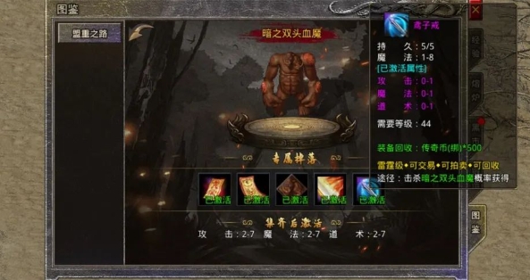 前期图鉴装备:在活动开放前,击败低级专属怪(如暗之骷髅精灵、牛魔王)掉落的图鉴装备切勿回收,务必存入仓库,等待活动开放后激活图鉴。