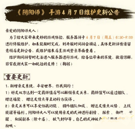 更新时间:阴阳师于4月7日(周五)6:30-9:00进行停服维护