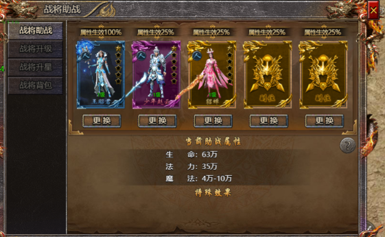 战将由一个主将和四个副将组成。主将继承100%的属性,而四个副将各继承25%的属性。完整的战将不可分解,但多余的碎片可以分解。