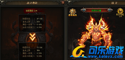 战灵同样是能够被挖掘潜能的,跟随主人一起升级一起变强。战灵潜能共有50级,通过消耗潜能值进行升级。战灵潜能升级能够获得高额的属性提升并且减少合击技能的CD。潜能值来源于BOSS掉落和寻宝产出。