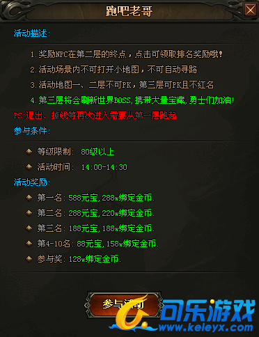 《散人传说》的跑吧老哥活动有什么奖励呢,又如何开启呢?这个活动开启后又要注意什么呢?散人传说跑吧老哥活动在每天14:00-14:30开启,当玩家达到80级以上就可以参加了,只要参加了活动的都会有奖励,我们来一起了解下吧!