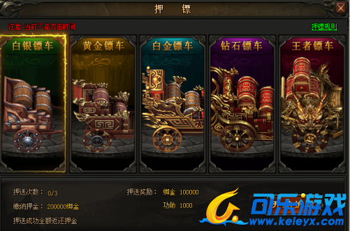 镖车分为白银镖车、黄金镖车、白金镖车、钻石镖车和王者镖车,押送成功后返还全额押金,并且获得押镖奖励。如果没有按照时间交镖(10分钟内)、被劫镖,就算押镖失败,不返还押金。每天有3次押镖机会,双倍时间比较划算。