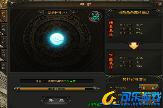 在散人传说中玩家等级达到30级以后开启神炉系统,打开神炉系统玩家可通过升级护符、护盾、宝石、圣珠,军印、特戒来增加各种属性。