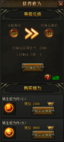 人物达到80级以后可以降低自己的等级来兑换转生修为值,低于80级将不可降级兑换修为!每天限制兑换3次通过商城购买转生丹
