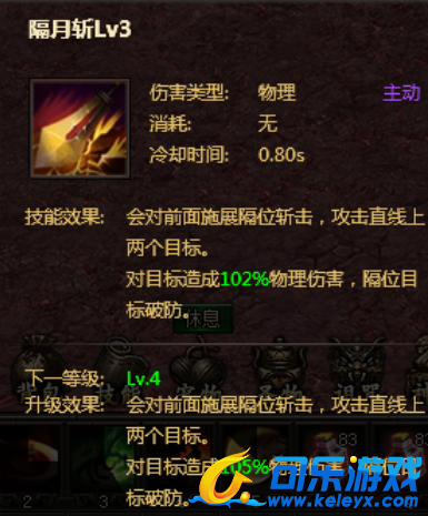 隔月斩是灭神游戏前期最基础的技能,隔月斩对前面的攻击单位施展隔位打击,攻击直线上的两个目标。