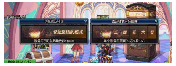 在体系菜单中点击挑选团队形式,能够挑选时刻界面,左面显现为账号人物能够进入大团形式的人物数量为天天10个,右边为每周账号能够进入团队形式的次数为三次。