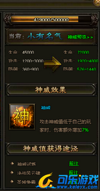 神威升级需要神威值,玩家获得神威值后,神威可以自动升级。神威值有很多获取方式:
