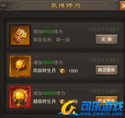 那么我们就要用到第二种方法,就是使用转生丹,转生丹有高级转生丹和超级转生丹。高级转生丹每个可以增加30000修为,每天可以使用20次,超级转生丹每个可以获得30W修为。