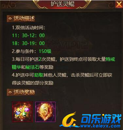 护送灵鲲是一个日常活动的玩法,每日可护送2次,每日0点刷新次数,护送到终点即可获得奖励,中途放弃或者灵鲲被击杀只能获得部分奖励,击杀灵鲲的玩家可获得部分奖励。11:30-12:00和18:30-19:00为双倍奖励时间,护送到终点即可获得双倍奖励。