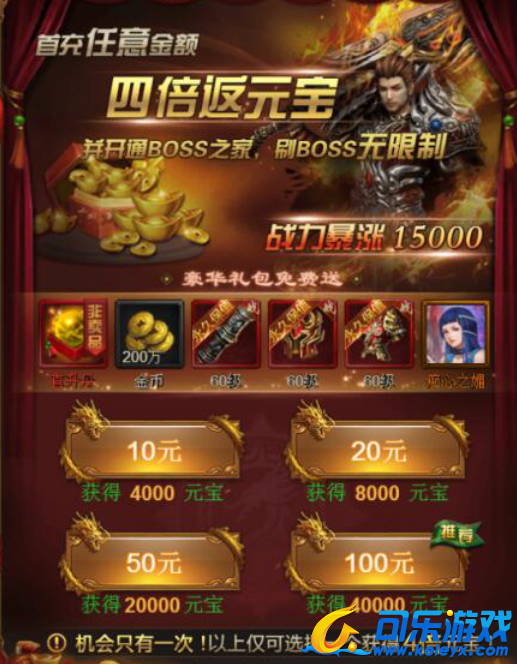 1,首充奖励不容错过,开服首充将返四倍元宝,并且还有豪华礼包赠送,至于首充多少就根据个人情况而定咯